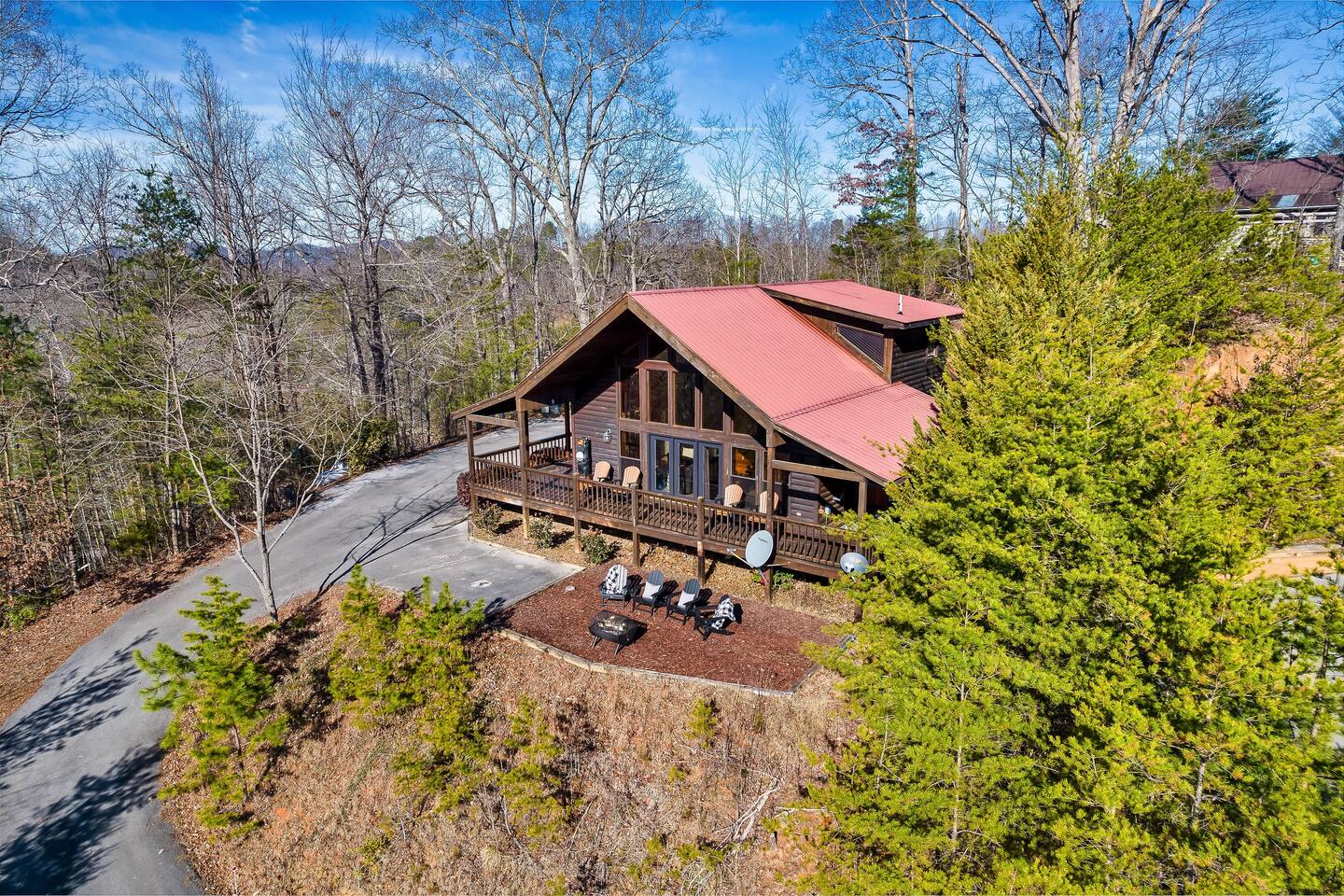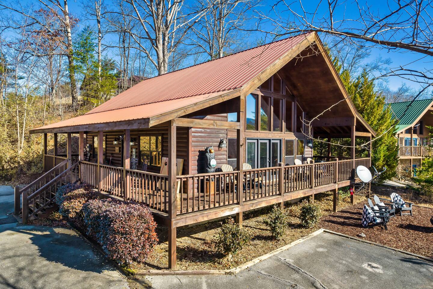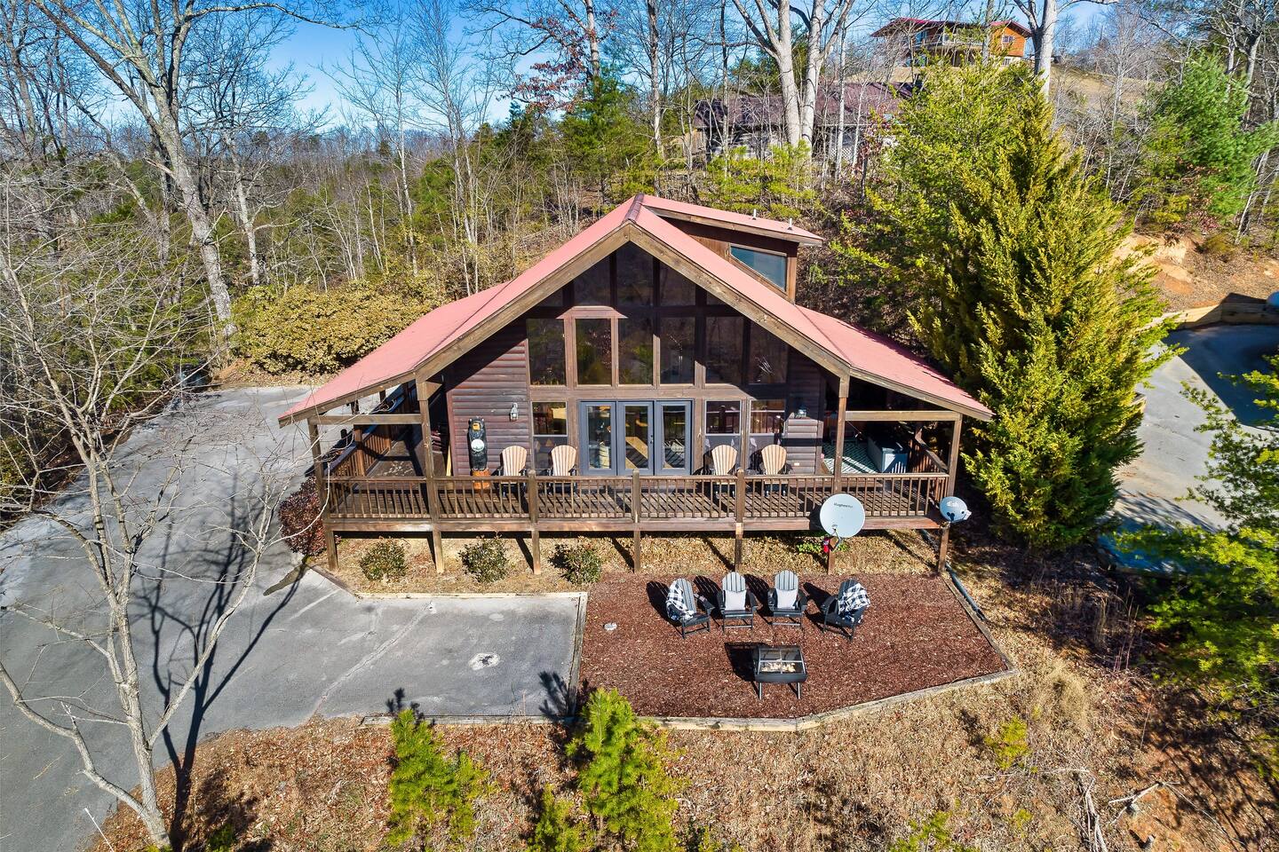 We are located at the end of the street on a cul de sac. There are a total of 3 cabins around us, and we're separated by tree's which provides a ton of privacy.